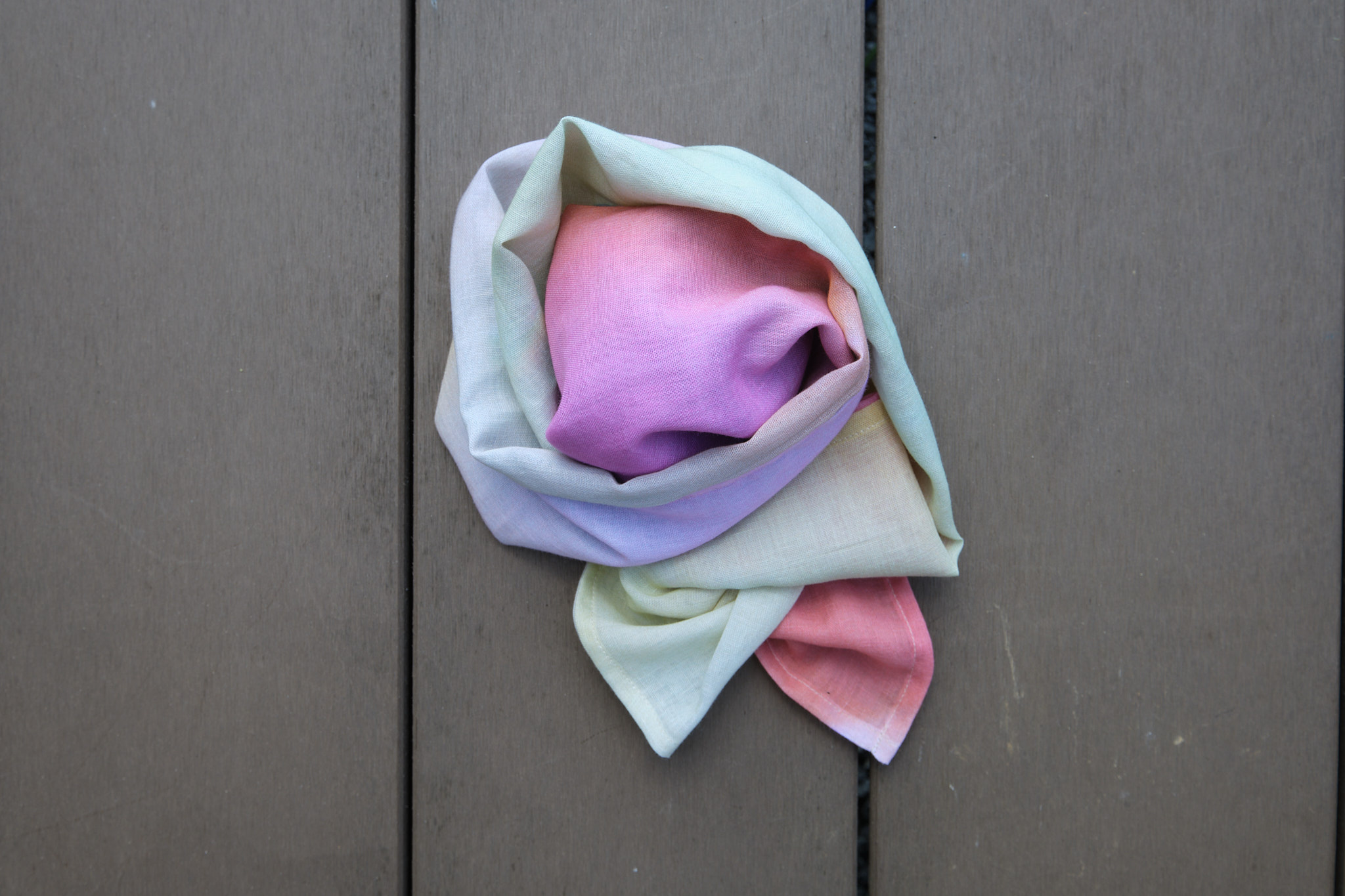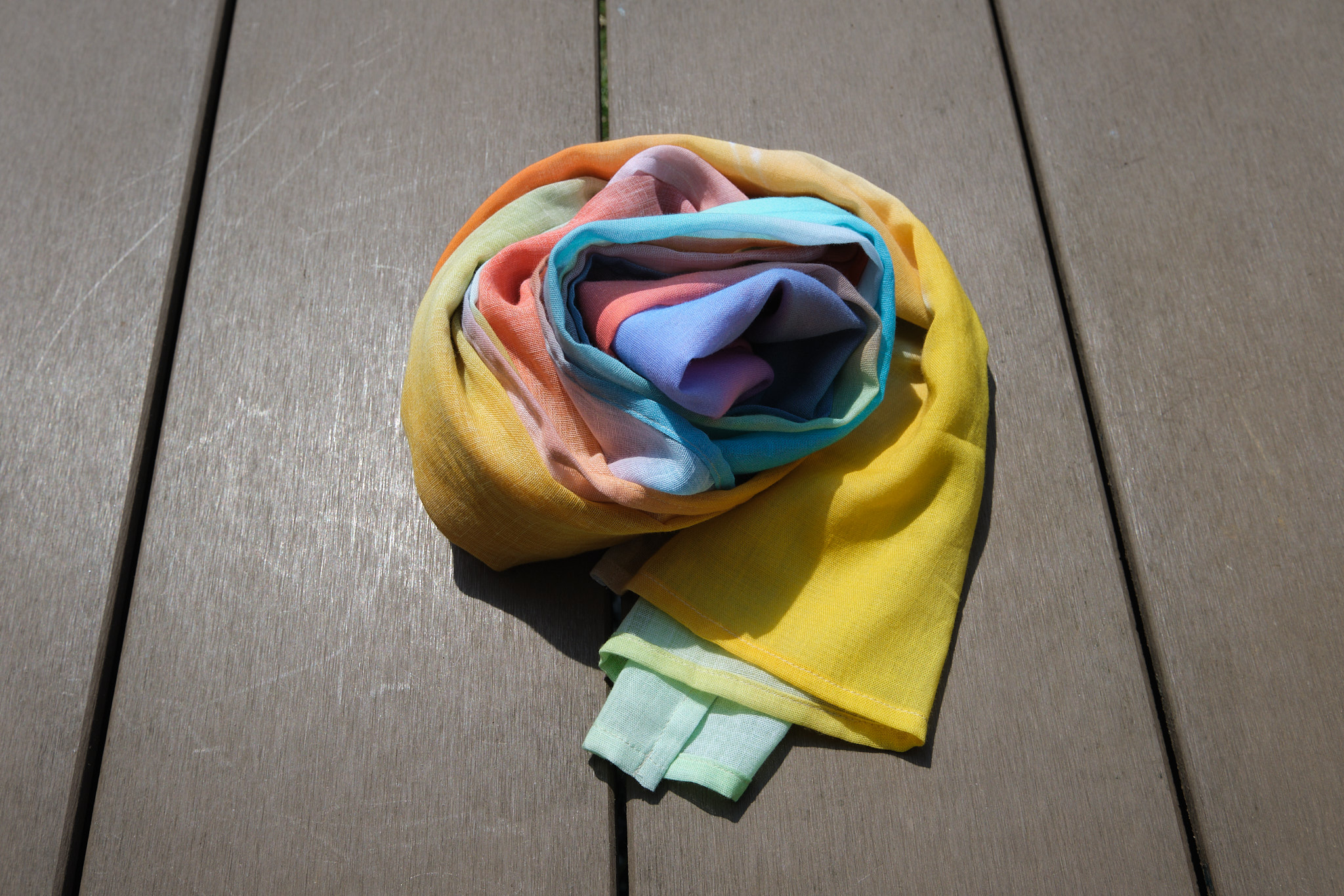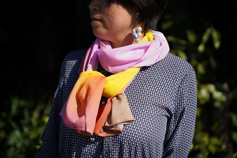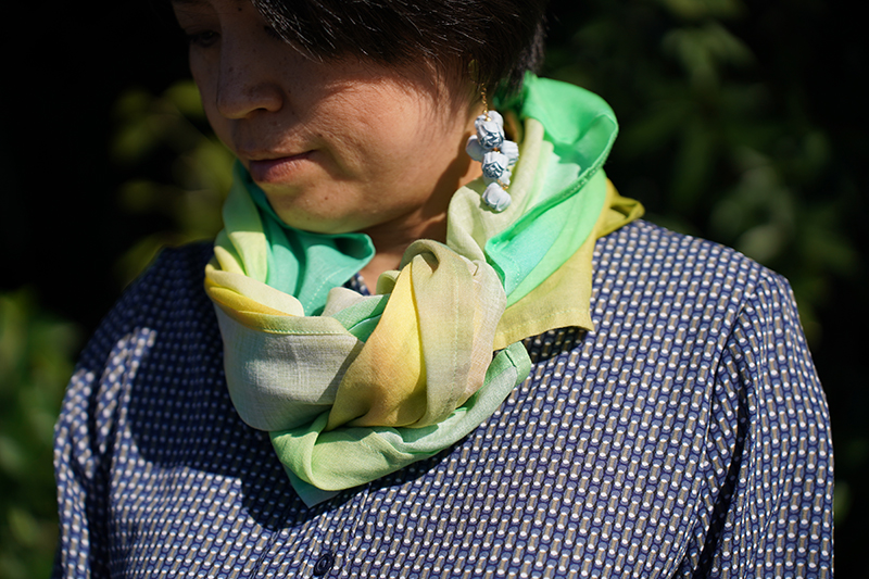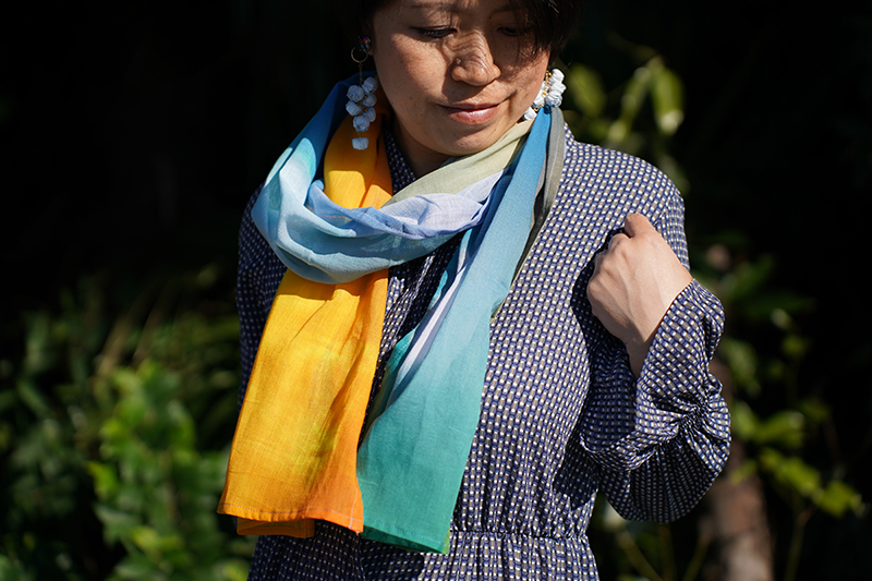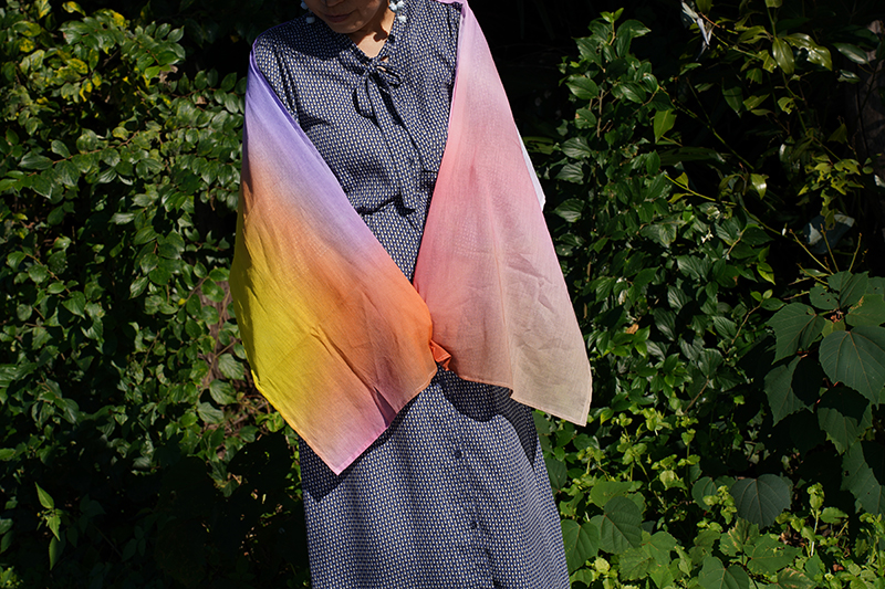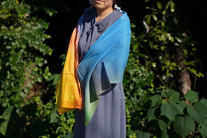 折る位置によって色の出方が変わるのでスカーフ、ストール以外にも帯締めやバックのハンドルに巻いたり、ヘアバンド・ターバンにして楽しむこともできますし、安心な日本製、肌触りも良いので正方形タイプは赤ちゃんのおくるみや敷いて撮影背景布としも使えますので他とは被らない出産祝い品としてもお薦めです。
