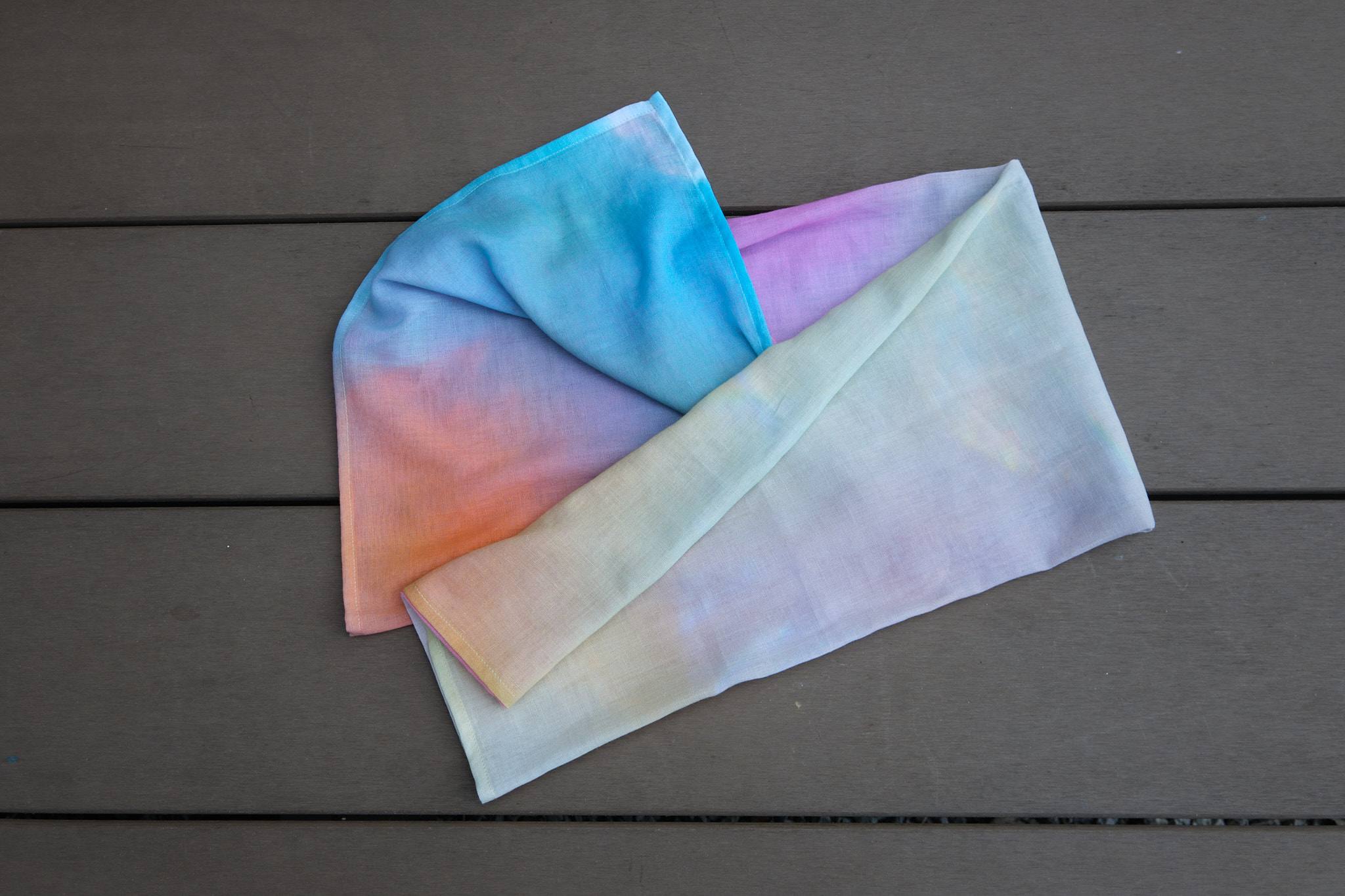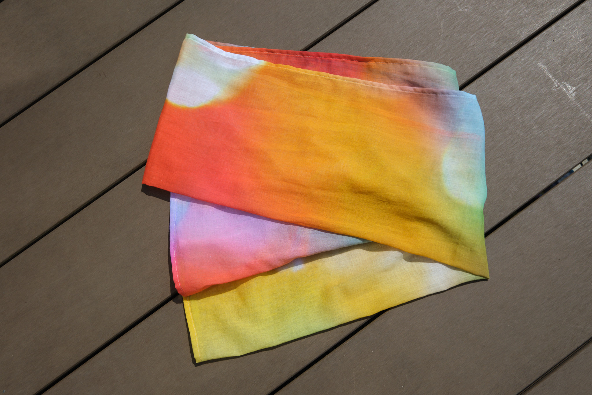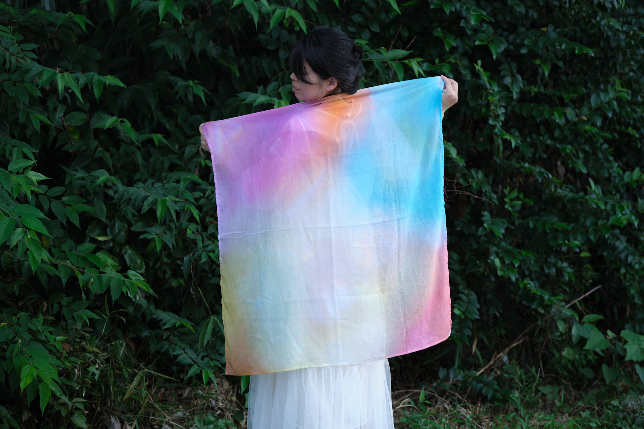 折る位置によって色の出方が変わるのでスカーフ、ストール以外にも帯締めやバックのハンドルに巻いたり、ヘアバンド・ターバンにして楽しむこともできますし、安心な日本製、肌触りも良いので正方形タイプは赤ちゃんのおくるみや敷いて撮影背景布としも使えますので他とは被らない出産祝い品としてもお薦めです。